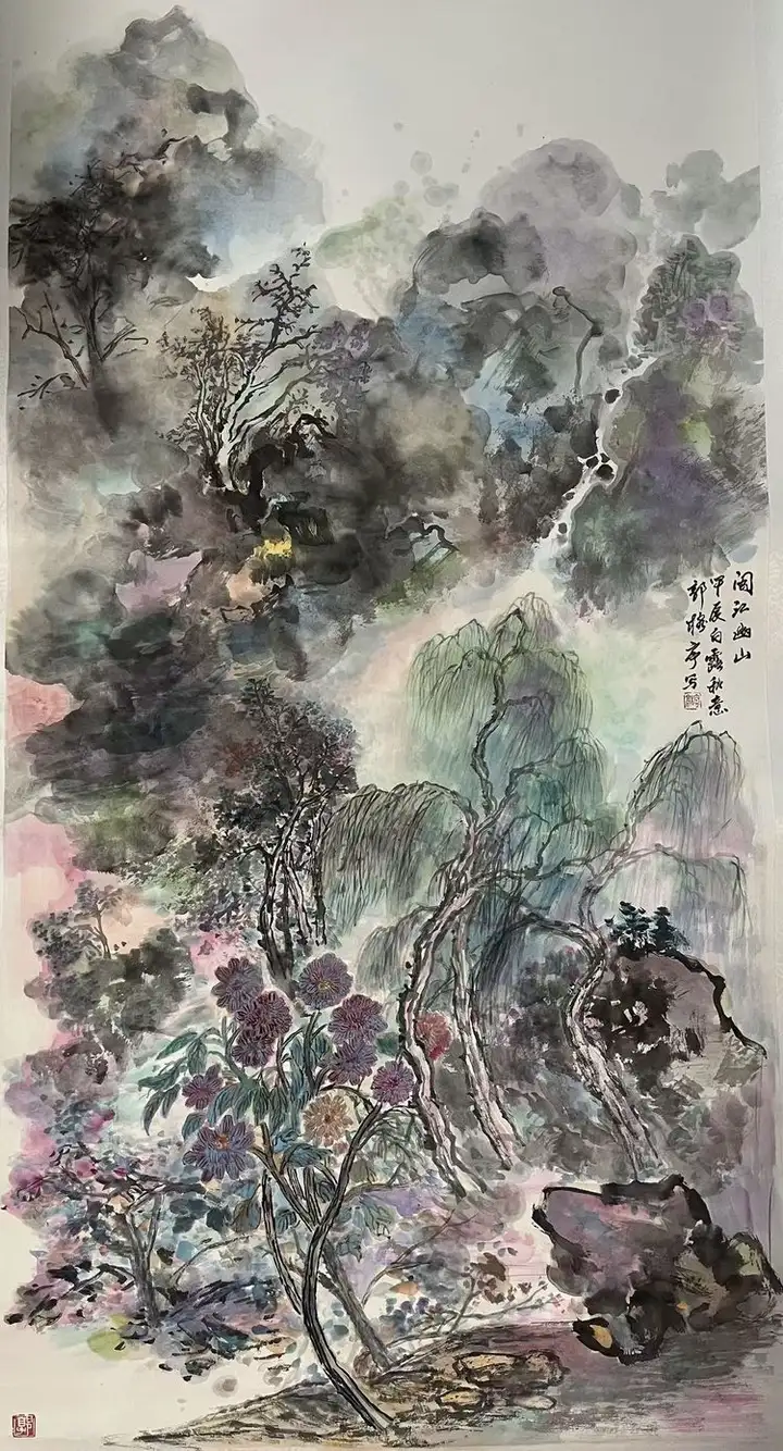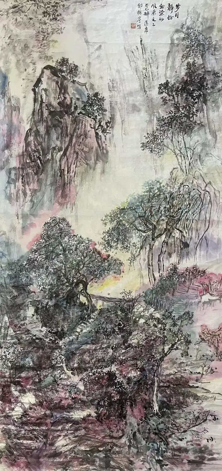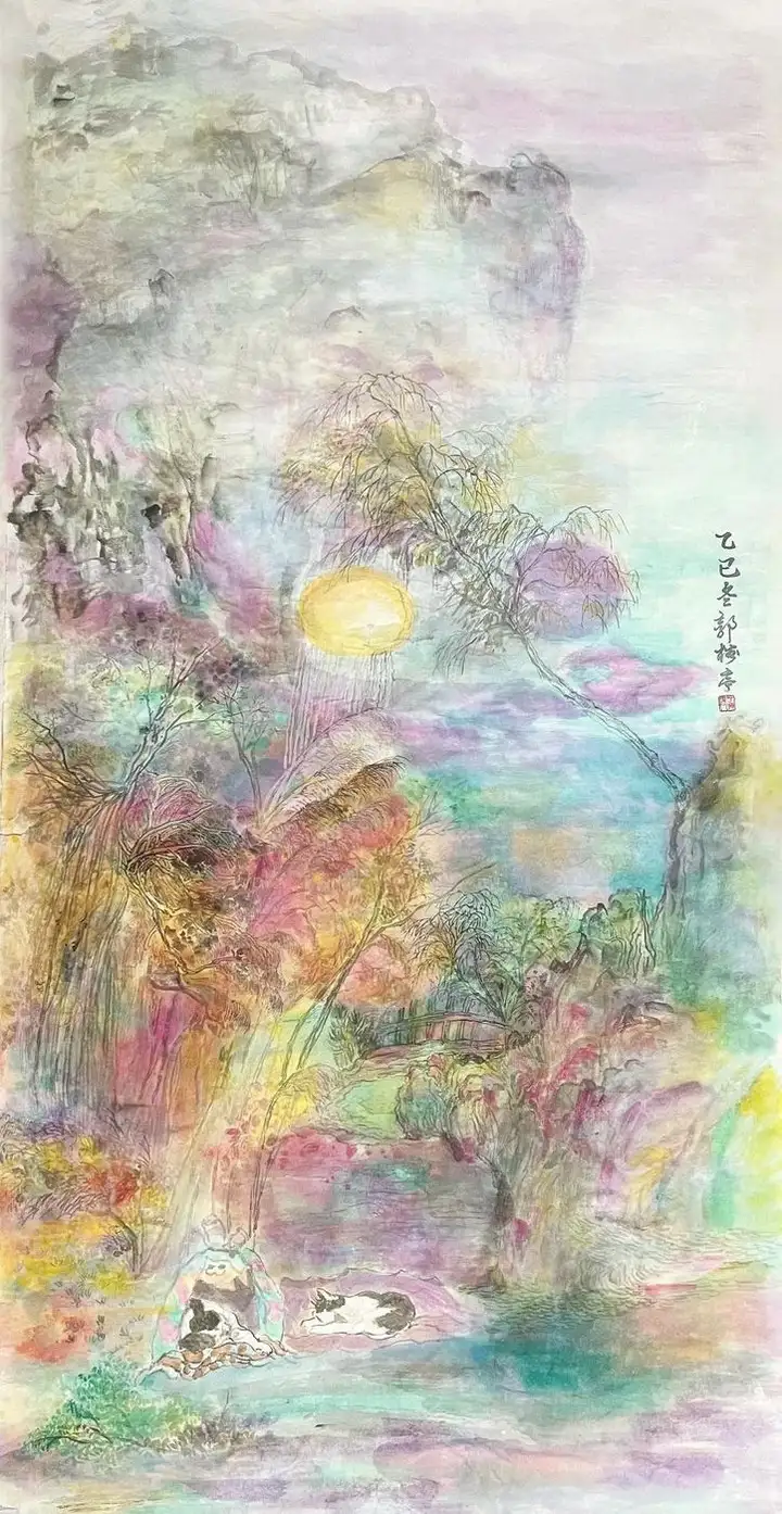 《梦境山水》创作于2025年,尺寸为138×69cm,是郭榕亭艺术生涯中的又一精品。该作品以其独特的彩墨山水风格,展现了画家对自然山水的深刻感悟和艺术再现。画面中,山水交融,色彩斑斓,既保留了传统水墨画的韵味,又融入了现代艺术的创新元素,令人仿佛置身于梦幻般的山水之间,感受到了大自然的无限魅力和神秘。