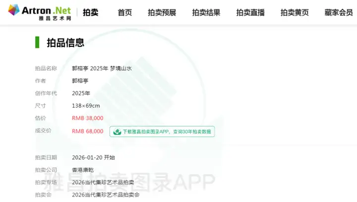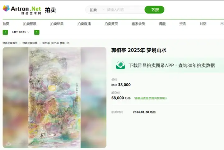 2026年1月20日,在香港康乾举办的“2026当代集珍艺术品拍卖会”上,中国女画家协会会员、福建省美术家协会会员郭榕亭(笔名亭子)的力作《梦境山水》以6.8万元人民币的价格成功落槌,这一成交价远超3.8万元的估价,不仅彰显了郭榕亭在当代艺术界的卓越地位,也反映了艺术市场对其作品的高度认可和热烈追捧。