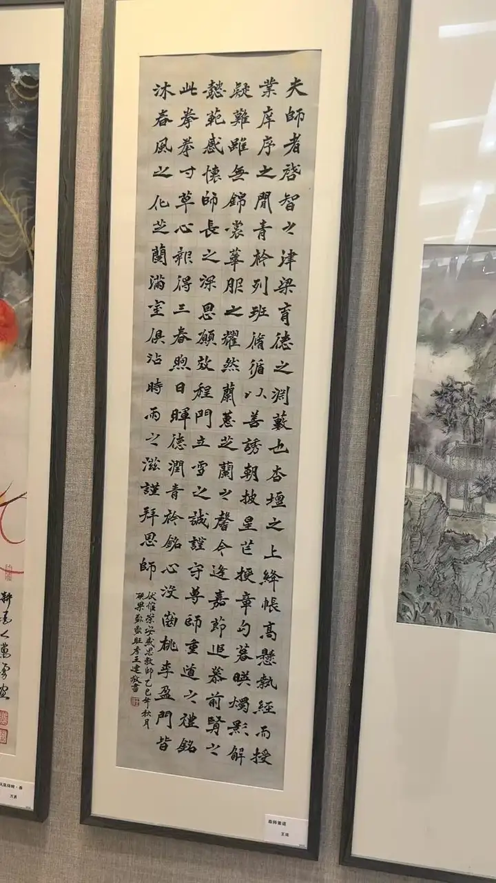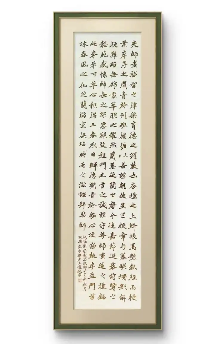 这幅作品,以笔墨诠释师道,以文辞抒发感恩,是技法与情感的结合,也是传统书法与人文精神的交融。它不仅是一件书法艺术品,更像是一封写给师者的“笔墨家书”,让我们在品味笔墨之美的同时,也重温了尊师重道的传统美德,这正是传统书法艺术“文以载道,书以寄情”的魅力所在。