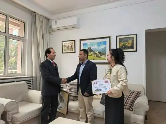 - 秘鲁大使馆官员与赖晨岳亲切握手,互相交流