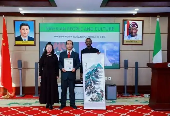 - 尼日利亚大使馆文化参赞收藏赖晨岳作品并颁发"中尼友好交流使者“荣誉证书