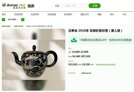 近日,一件由知名陶艺家沈孝俊创作的2018年珐琅彩紫砂壶(美人肩)在英国罗素拍卖会上以31.3万元人民币的高价成交,再次证明了其作品在艺术品市场的卓越地位和收藏价值。