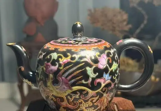 沈孝俊的这件珐琅彩紫砂壶(美人肩)创作于2018年,尺寸为长14.8cm×宽8.6cm×高10.3cm,不仅线条流畅、古朴典雅,更在传统制作技艺中融入了新意,展现出清逸隽秀的艺术风格。该作品以紫砂为载体,通过珐琅彩的装饰手法,将传统紫砂艺术与现代审美理念完美结合,呈现出独特的艺术魅力。壶身图案精美,色彩丰富,既体现了紫砂的质朴之美,又彰显了珐琅彩的华丽之姿。