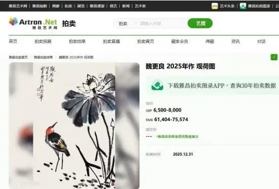 在2025年12月31日英国罗素拍卖会的落槌声中,一幅名为《观荷图》的水墨作品以12,650英镑的价格成交,让画家魏更良的笔墨再次跨越山海,在国际艺术舞台上绽放东方美学的光芒。这幅设色纸本作品,不仅是画家对自然与生命的诗意捕捉,更是中国传统水墨在当代艺术市场中价值的有力印证。
