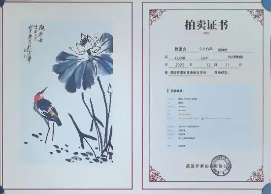 此次在英国罗素拍卖会上的成交,不仅是对《观荷图》艺术价值的认可,更折射出中国当代水墨在国际市场的逐步升温。46×68cm的尺幅虽不算宏大,却以精炼的构图与饱满的情感,打动了海外藏家。12,650英镑的成交价,不仅体现了作品本身的艺术分量,更反映出全球艺术界对中国传统艺术当代转化的关注与肯定。在文化交流日益频繁的今天,这样的拍卖结果,既是魏更良个人艺术生涯的重要节点,也是中国水墨艺术走向世界的生动注脚——它证明了,跨越语言与地域的艺术语言,依然能在不同文化背景的观者心中唤起共鸣。《观荷图》的拍卖落幕,并非艺术生命的终点,而是新的开始。它带着东方的墨韵与诗意,在异国的收藏空间中继续生长,让更多人透过这一方荷塘,读懂中国艺术的含蓄与力量,感受“一花一鸟一世界”的东方智慧。而魏更良们的笔墨探索,也将在这样的交流与回响中,继续为中国传统艺术的当代传承与传播,铺就更广阔的道路。