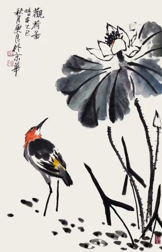 《观荷图》以简洁而富有张力的笔墨,勾勒出荷塘一隅的生机。画面右侧,一朵盛放的荷花亭亭玉立,墨色浓淡交织的荷叶如伞盖舒展,叶脉间的留白透着通透与空灵;左侧,一只水鸟昂首伫立,红冠、黑羽与黄腹的色彩对比鲜明,细长的腿爪踏在错落的墨点之上,仿佛正凝神聆听荷塘的私语。题款“观荷图 时在乙巳 秋月更良于京华”,既点明了创作时序,也将画家身处京华的心境与自然景致融为一体,寥寥数字间尽显文人画的雅致与洒脱。