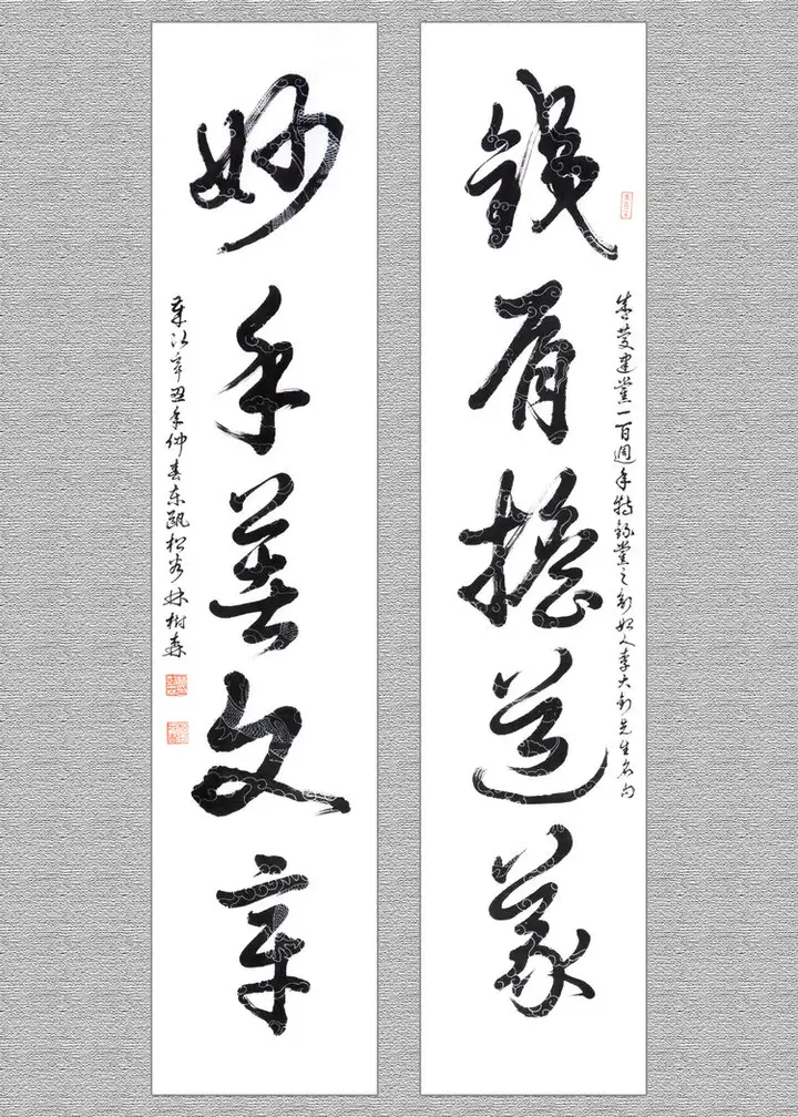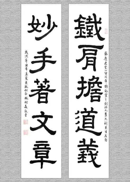 鐵肩擔道義,妙手著文章;(隶书)规格105cmx23cmx2.该作品已被中国邮政入选《百年沉淀,共铸辉煌;庆祝中国共产党建党一百周年》主题,“国家名片,限量版珍藏邮册”,收录出版。