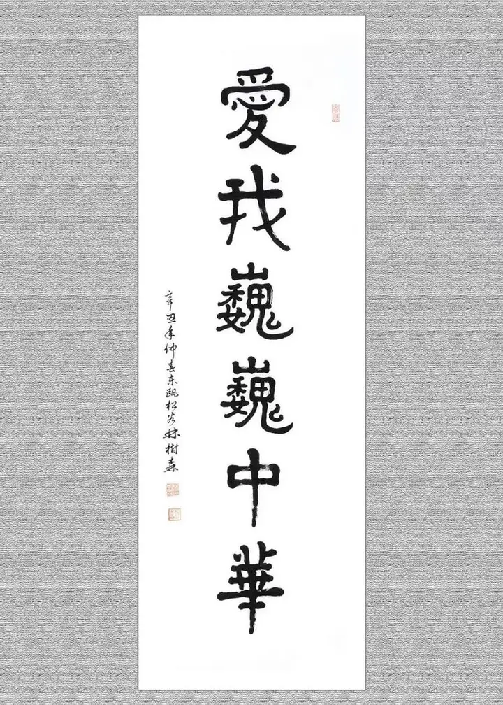 愛我巍巍中華(楷书)规格120cmx34cm,该作品已被中国邮政入选《百年沉淀,共铸辉煌;庆祝中国共产党建党一百周年》主题,“国家名片,限量版珍藏邮册”,收录出版。