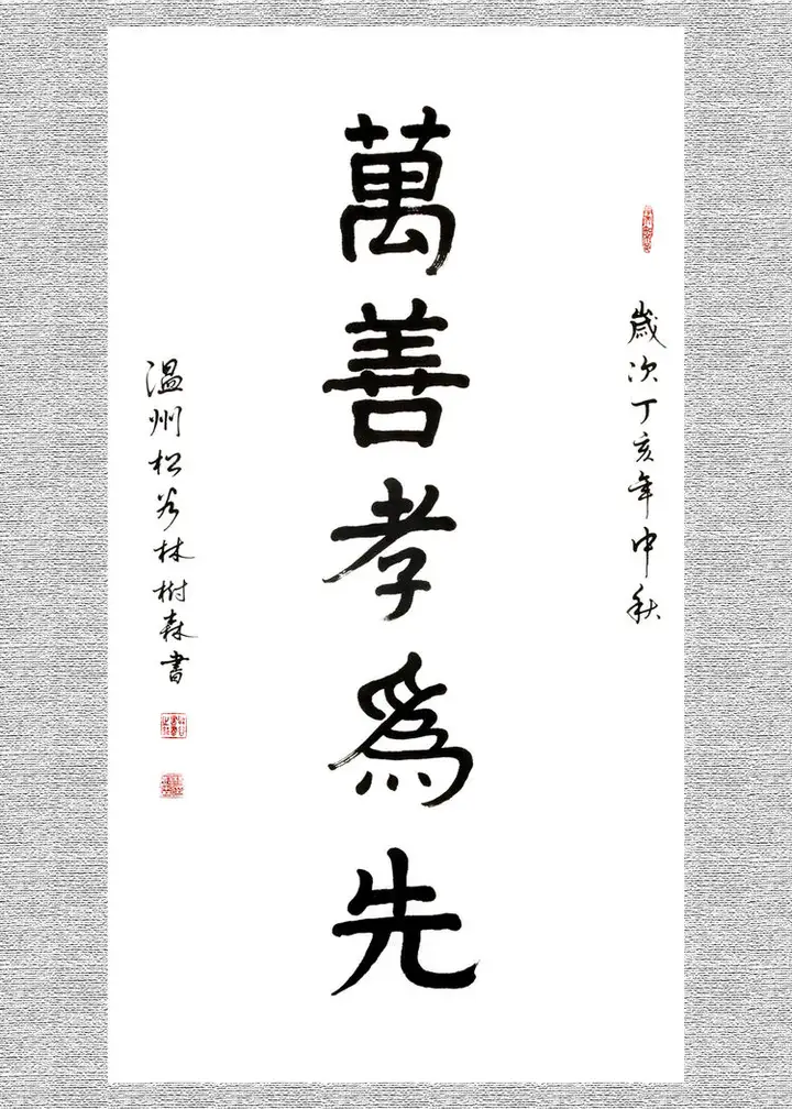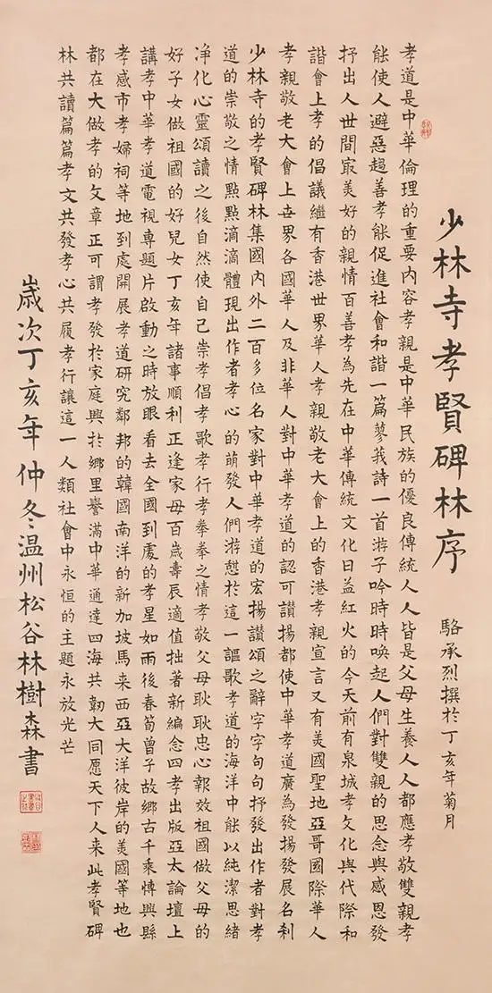 萬善孝为先(楷书)规格138cmx69cm. 该作品因少林寺孝贤碑林特邀入选;作品2016年被中国邮政入选《中国传世名家名作专题邮册》珍藏版收入出版。