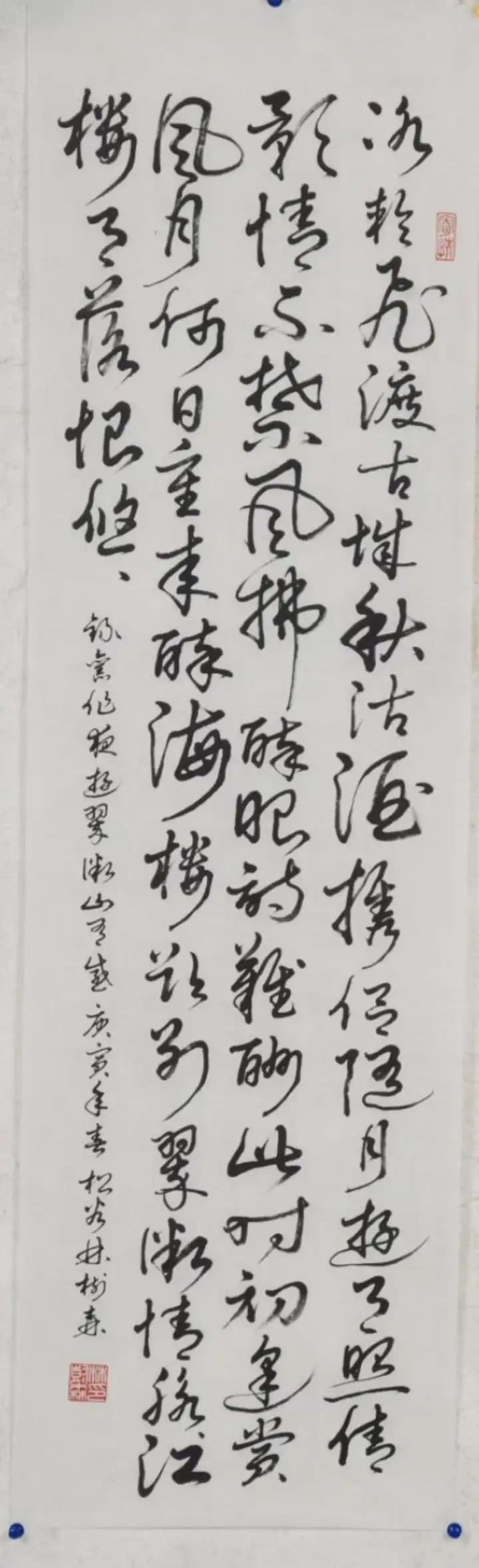 作品.撰作:七律诗《夜遊翠微山有感》(草书),规格120cmx34cm;该作品已被中国邮政入选《百年沉淀,共铸辉煌;庆祝中国共产党建党一百周年》主题,“国家名片,限量版珍藏邮册”收录出版。