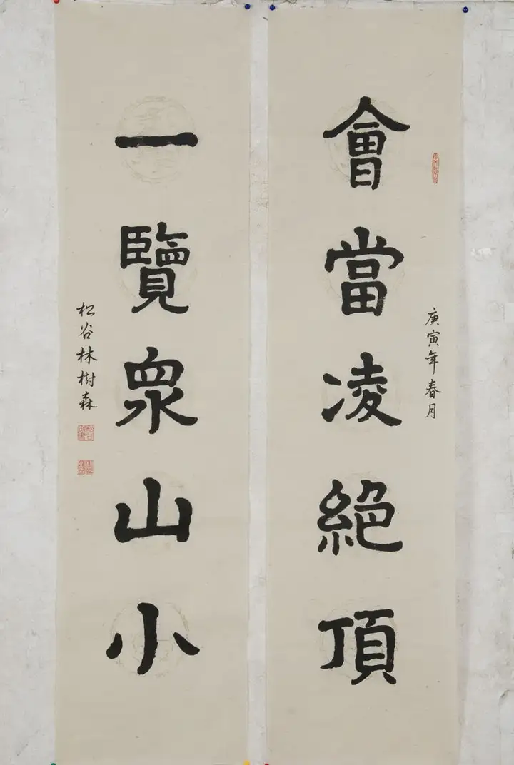 會當凌绝頂,一覽衆山小;(楷书)对联.规格138cmx34cmx2.该作品2016年被中国邮政入选《中国传世名家名作专题邮册》珍藏版收录出版。