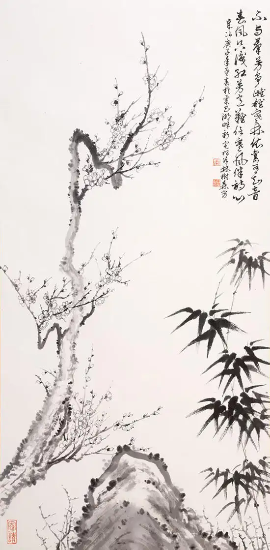 梅竹图(水墨画)规格69cmx33cm.该作品已被中国邮政入选《百年沉淀,共建辉煌;庆祝中国共产党建党一百周年》主题,“国家名片”,限量版珍藏邮册”收录出版。