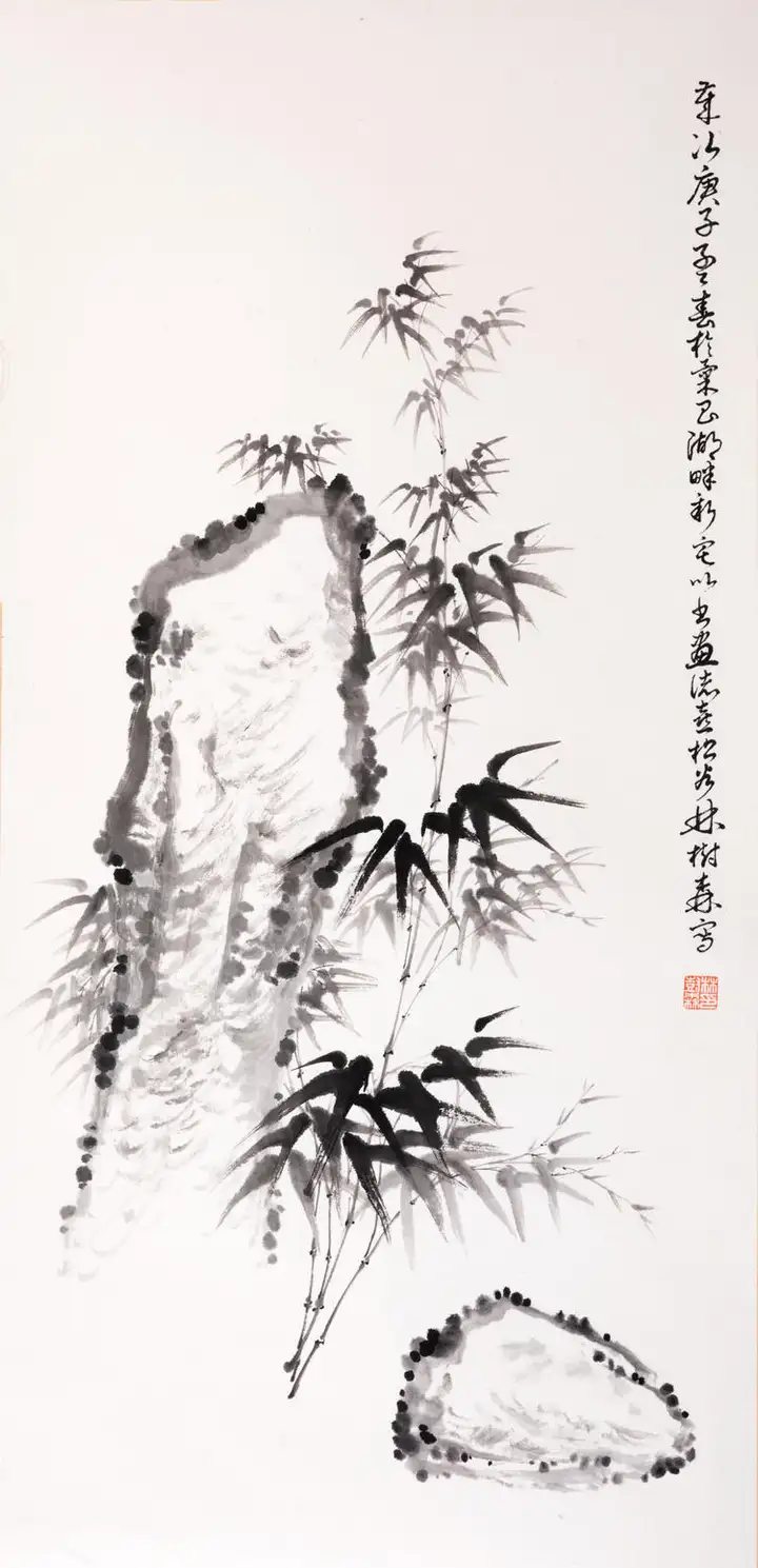 竹石图(水墨画)规格69cmx33cm.该作品已被中国邮政入选《百年沉淀,共建辉煌;庆祝中国共产党建党一百周年》主题,“国家名片”,限量版珍藏邮册”收录出版。
