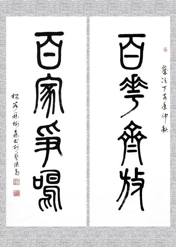 百花齐放,百家争鸣(石鼓文)规格69cmx34cm.该作品2016年已被中国邮政入选《传世名家名作专题邮册》珍藏版收入出版。