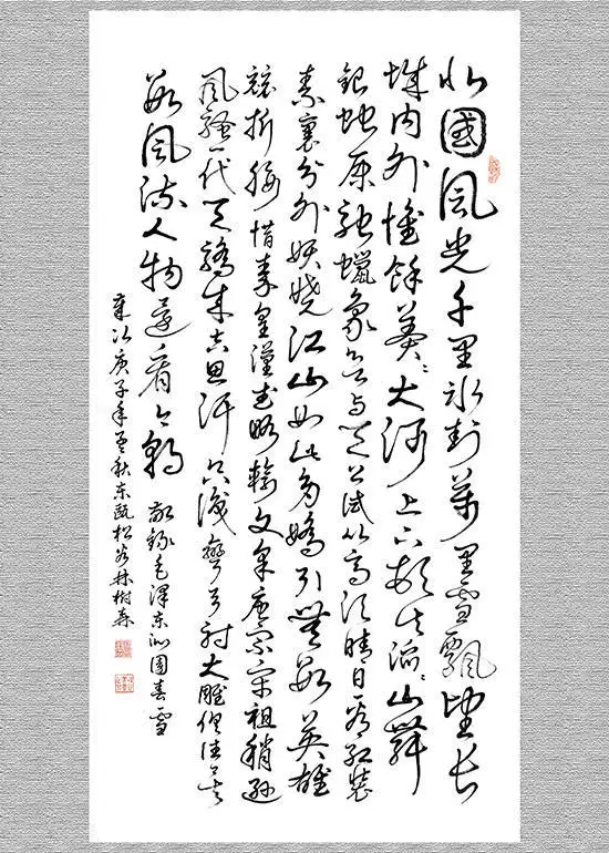 沁园春(雪)草书,规格138cmx69cm.该作品已被中国邮政入选:《百年沉淀,共铸辉煌,庆祝中国共产党成立一百周年》主题,“国家名片,限量版珍藏邮册”收录出版。