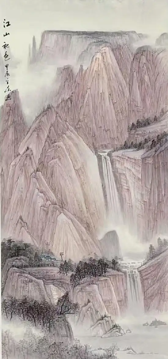 刘立荣的古意山水,是传统工笔技法与当代审美语境的精妙对话。在《鸿运当头》中,他以朱砂点染山峦,层叠的红黑墨色间,云雾似有流动的质感;《江山秋色》里,淡赭色的岩壁肌理细腻如刻,飞瀑的留白处藏着数十年的工笔功底。每一道皴法、每一层晕染,都在宣纸的纤维纹理间沉淀着对传统的敬畏。宣纸“墨分五色”的特质,更让他的作品在浓淡虚实间,呈现出古意山水的空灵与厚重,既有北宋山水的雄浑气象,又不失文人画的雅致意趣。