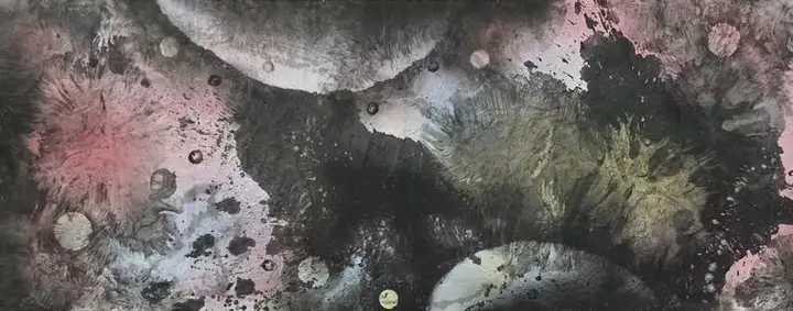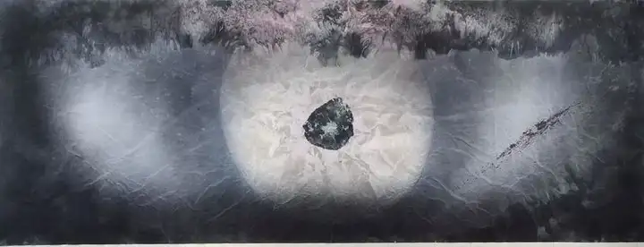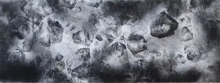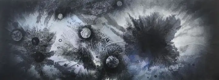 创作过程中,为表现出宇宙的神奇景象,画家遇到过无数的难题,因为想表现出宇宙的特殊效果,从古往今来的传统水墨绘画技法中是无迹可寻的。有时候,他为了表现出陨石在宇宙中的各种动态,反复尝试不同的绘画技巧,为达到心中的理想效果。做了大量的尝试,他用尽了各种技法实验,从艰辛的开端到层出不穷各种绘画新技法的出现,每一次挫折都成为了他前进的动力,他、走向了成功。