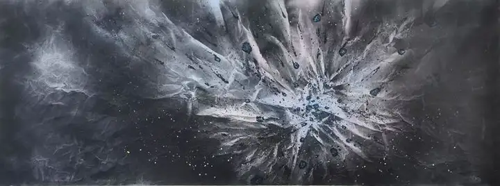 时光流转到2014年,一个看似平常的夜晚,画家在睡梦中被一个人影带入了一片神秘的境地。一位老者出现在苍穹之上,周身散发着的奇异的光茫,仿佛来自遥远的外太空。老者凝视着画家,声音低沉地说:“我是宇宙之灵,今天在梦里见你,是希望你来描绘出宇宙的浩瀚与神秘,画出那穿梭于宇宙间的星球和陨石。说完,老者引画家走上了一个平台。画家眼前出现了一幅壮丽的景象:深邃的宇宙中,繁星闪烁,庞大的陨石群拖着长长的尾焰,在他身旁掠过,黑暗中划出一道道绚丽的轨迹。