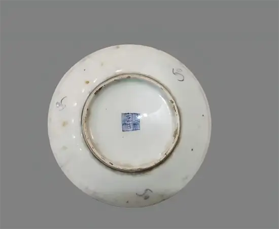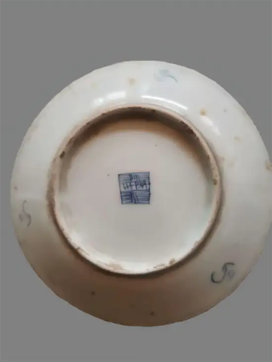 3.盘底有青花款识,胎质细腻,盘身有自然老化痕迹,清制品,这类瓷盘常以花卉、吉祥纹饰为主题,青花发色纯正,画工精致。