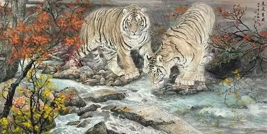 她以“骨法用笔”勾勒虎纹,线条细劲如游丝,精准勾勒出皮毛的蓬松质感;又以“随类赋彩”渲染毛色,通过宣纸“墨分五色”的特性,让虎毛在光线下呈现出层次丰富的明暗变化,既保留了工笔画的精致严谨,又赋予作品鲜活的生命力。这种“以形写神”的创作理念,使她的虎画跳出了传统“符号化”的桎梏,成为兼具学术价值与审美价值的当代典范。