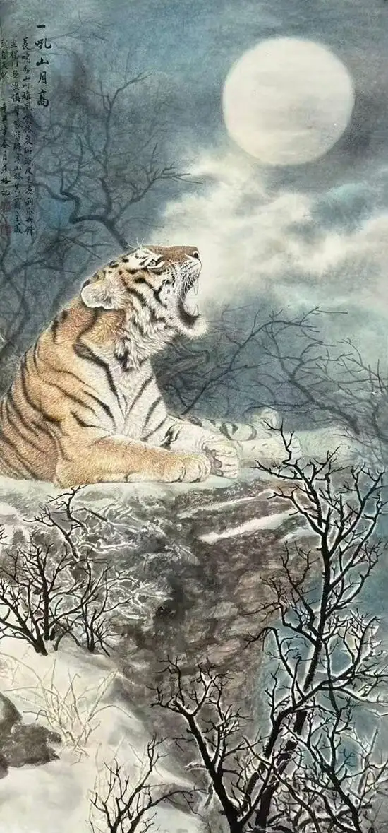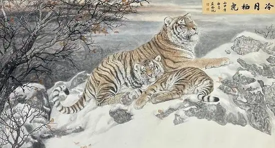 秦燕格的艺术高度,源于她对传统工笔技法的深刻领悟与创新突破。她师承黄独峰等名家,又在李可染画院、荣宝斋工作室深造,其笔下的虎既有“上山虎”的威严霸气,也有“下山虎”的灵动机敏,更在《虎虎生威》《冷月栖虎》等作品中融入了母子相依的温情瞬间。