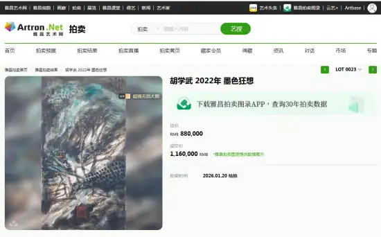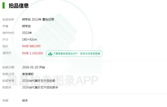 香港康乾拍卖有限公司在2026当代集珍艺术品拍卖会上,著名画家胡学武作品《墨色狂想》经过场内数轮激烈竞投,在拍卖师清脆的落锤声中最后以1160000人民币圆满成交,其卓越的艺术价值和市场潜力获得收藏界权威人士的高度认可。