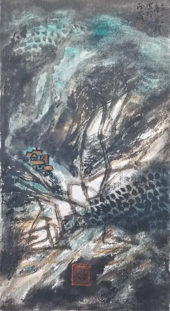 胡学武对草书笔法的创造性运用,展现出对艺术本体规律的深刻洞察。草书线条的连绵性与不可复制性,赋予画面独特的“意象性”与“书写性”。当“拖拉槌砸”的笔触跃然纸上,观者感受到的不仅是山石的形态,更是艺术家创作时的情绪轨迹。这种以笔势贯穿画面的方式,巧妙化解了传统山水画中易出现的琐碎与匠气,使作品在抽象化的同时,依然保持着内在的气韵贯通。如张彦远在《历代名画记》中强调的“骨气形似皆本于立意,而归乎用笔”。胡学武的实践恰是对这一理论的当代演绎。