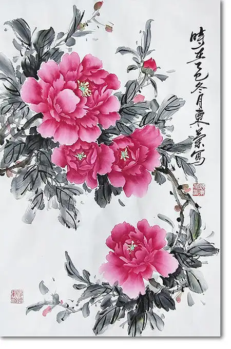 舒东菊女士的这幅牡丹图,以浓艳而不失清雅的胭脂红写花,以苍润朴拙的墨色绘叶,笔墨间既有会派牡丹灵动洒脱的气韵,更蕴含着一份根植于田园的温润情怀。出身书香门第的她,在三十余载教育生涯与家庭文化熏陶中,将田园生活的质朴意趣融入牡丹创作,让雍容华贵的国花,成为承载东方田园精神的载体。